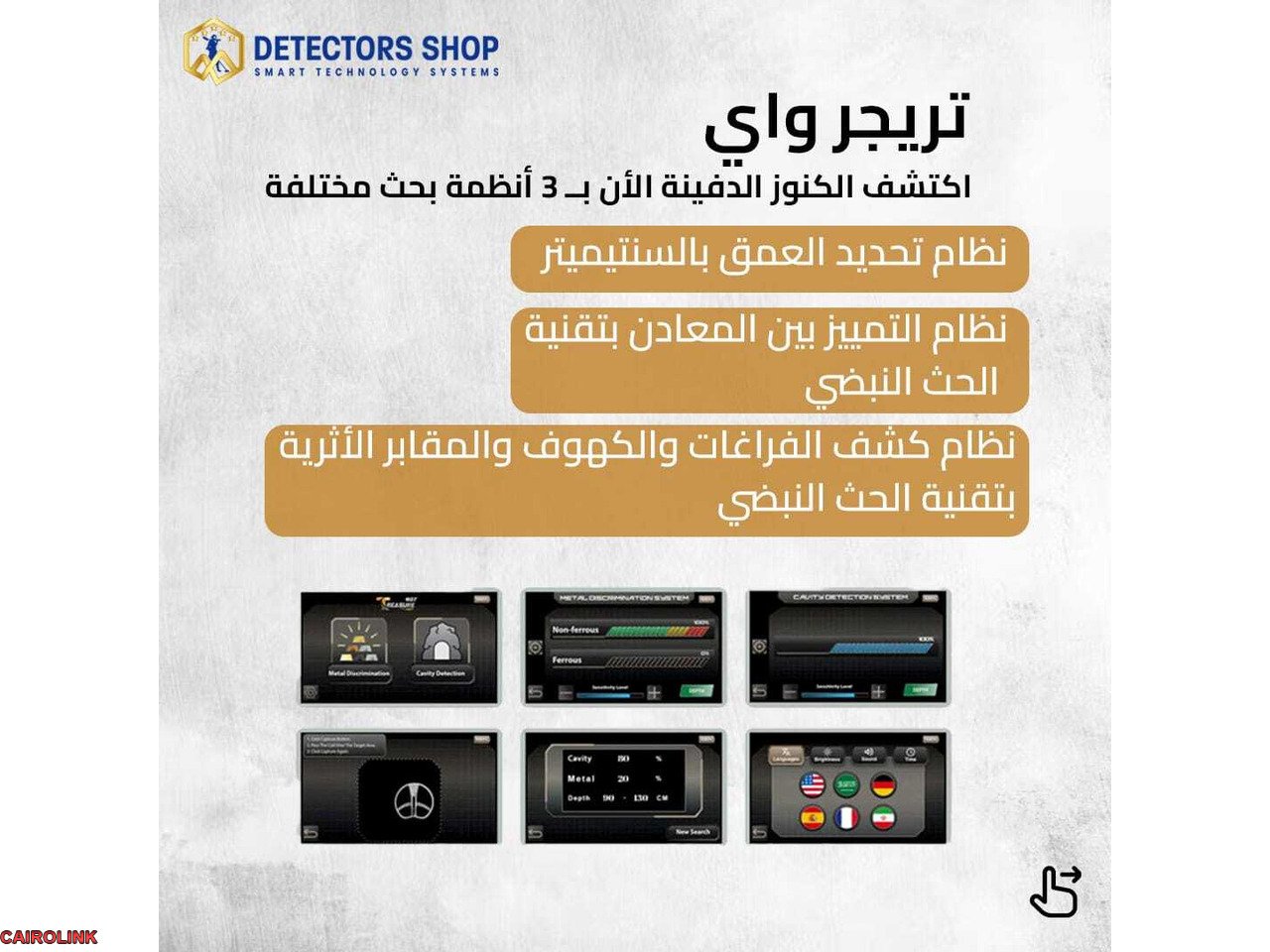 • ثلاثة أنظمة بحث احترافية متطورة تتيح لك استكشاف الأهداف بدقة متناهية، سواء كانت كنوزًا، فراغات، أو قبورًا أثرية مدفونة.
