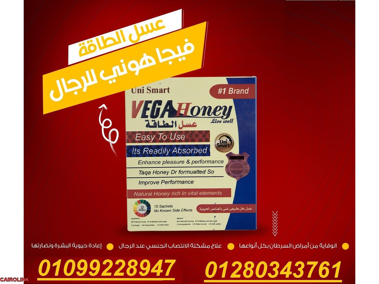 فيجو هوني هو الحل السحري لمشكلة الانتصاب الجنسي عند الرجال، وأيضًا مفعل قوي للرغبة الجنسية لدى الطرفين، حيث يمنحكما تجربة مثيرة وممتعة. لكن الفوائد لا تتوقف عند هذا الحد؛ فالعسل يمثل درعًا يحميك من علامات الزمن، ويخفف التجاعيد والخطوط الرفيعة، ليعيد إليك نضارة شبابك. ومن جهة أخرى، يساهم عسل الطاقة، مثل فيجا هوني، في حماية الجسم من مخاطر السرطان بأنواعه المختلفة، ويعمل على تعزيز صحتك بشكل عام. إذا كنت تشعر بالتعب أو الإرهاق المستمر، فإن العسل يمكن أن يكون رفيقًا رائعًا لك؛ فهو يخفف من الشعور بالإرهاق ويعيد لك النشاط والحيوية. ومع أكياس عسل الطاقة، يمكنك معالجة تلف الأنسجة والخلايا داخل الجسم بفاعلية. كما أنه يساعد في التخلص من مشكلة