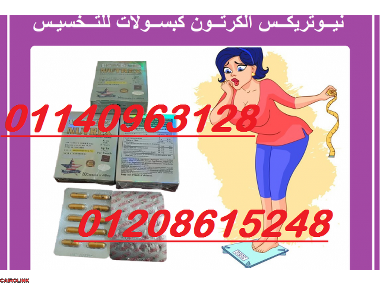 كبسولات نيوتركس للتخسيس NUTREX كبسولات نيوتركس في شكلها الجديد.. بتركيز أعلي ومفعول أقوي مميزات كبسولات نيوتركس :- بيقفل الشهية تماماً (هتنسي الأكل مش بس نفسك هتتسد)- بيحرق 2000 سعر حراري في اليوم- بيرفع معدل الميتابوليزم في الجسم ويحسن الحرق الطبيعي- بيحرق الدهون المتكتلة بالجسم???? ويقضي علي الخلايا الدهنية كبسولات نيوتركس الجديدة أفضل حل لمشاكل زيادة الوزن ‼ ونحت الجسم فهي بديل طبيعي لعمليات تدبيس وتكميم المعدة بدون مشاكل جراحية نيوتركس اعشاب طبيعية 100% ، يحتوى على خلاصات طبيعية من الألياف والفاكهة ومكون من الكورميوم والجارسينيانيوتركس 30 كبسولة تكفي لمده 30يوم مش بس بيخسس كمان بينشط الجسم / بيقوي المناعة /بيكافح الشيخوخة / مضاد للاكسدة / بيخفض دهون الدم / مقاومة السيلولايت / بيشد الجلد ويقضي علي الترهلات / وبيحرق 2000 سعر حراري في اليوم معدل التخسيس من 8 الي 12 كيلو