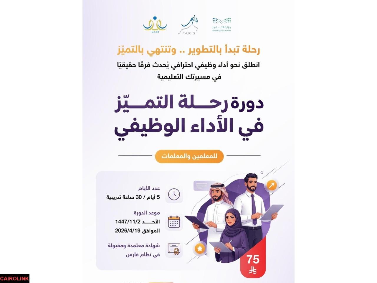 انطلقت الآن دورة "التميز في الأداء الوظيفي"؛ دورة معتمدة ومقبولة رسمياً، مصممة خصيصاً لكل معلم ومعلمة يبحثون عن التميز المهني وتطوير الأداء.