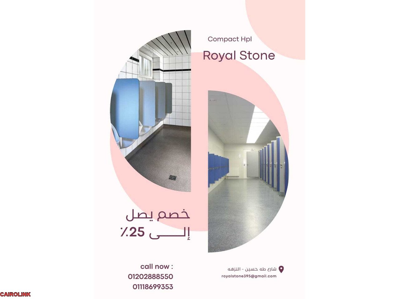 فكر صح واختار ?رويال ستون لاننا بإختصار أولى الشركات اللى هتقدملك خامة الكومباكت هتلاقى فيه كل عوامل الجودة وسهل جدا تصمم منه دواليب و لوكرز وقرص الترابيزات ومصمم خصيصا لمقاومة عوامل الجو والمياه وبنتسخدم افضل خامة من الاكسسورات اللى تعيش و بجودة عالمية كومباكت HPL خامة هتعيش معاك طول العمر رويال ستون هتساعدك تخلى منتجكك مميز عن الباقى وهتساعدك على تنفيذ التصميم اللى تحبه يلا متترددش اتصل بينا على 01202888550 – 01118699353 - 01098854595