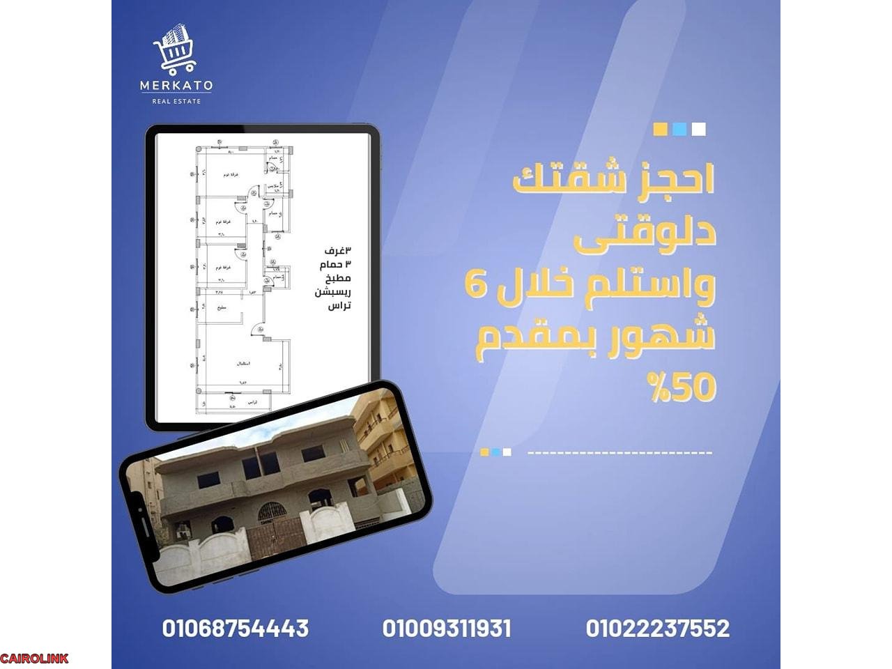 0 ج.م احجز دلوقتي شقتك واستلم خلال ٦ شهور وبمقدم ٥٠٪ وتسهيلات على سنة بواسطة ميركاتو العقاريه
